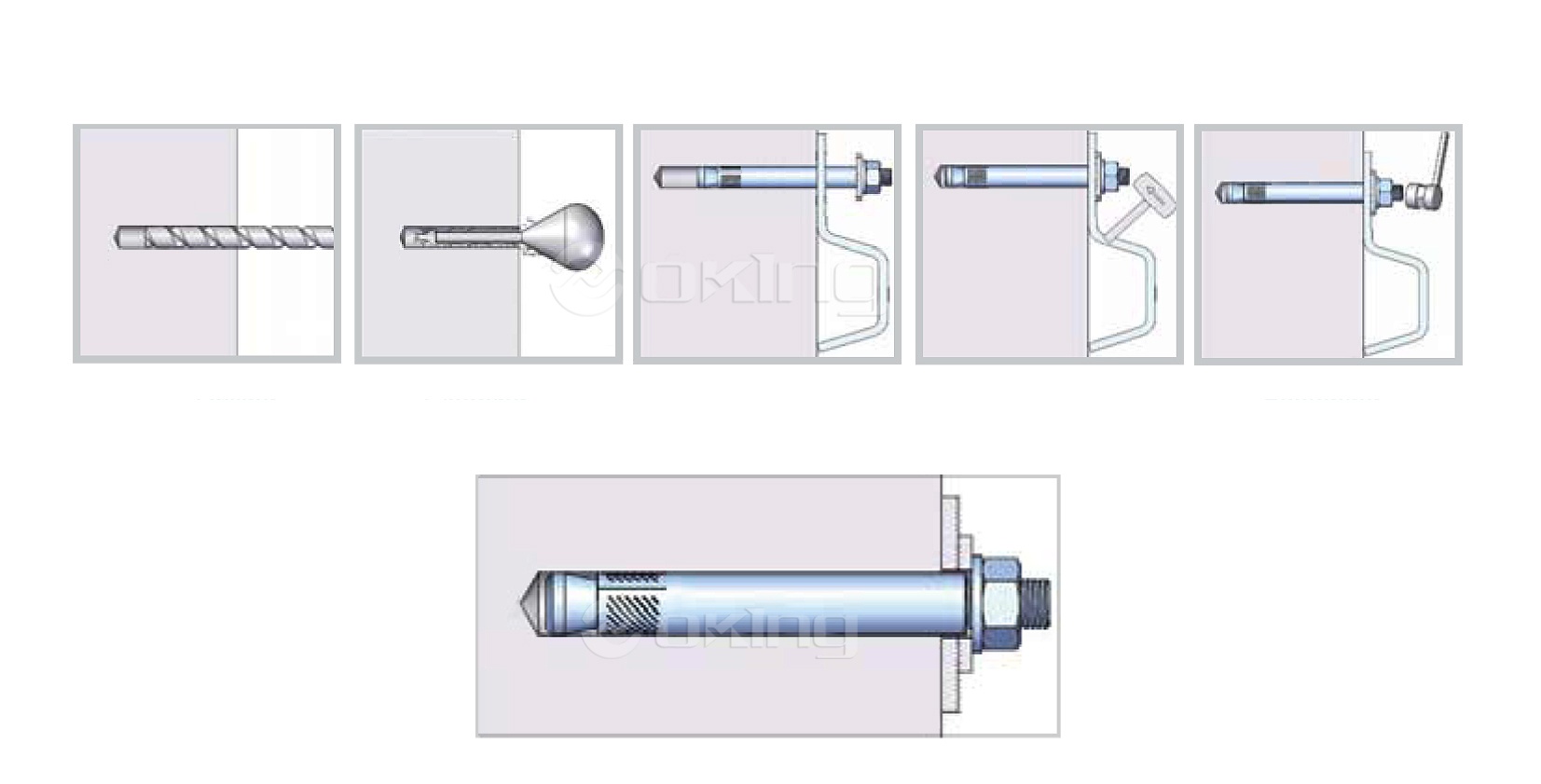 ● 구멍의 잔해물을 모두 제거한 다음 앵커를 고정 장치의 구멍을 통해 또는 콘크리트에 직접적으로 드릴로 구멍을 뚫는 구멍에 두 배로 원하는 범위에 설치하게 되었습니다.
