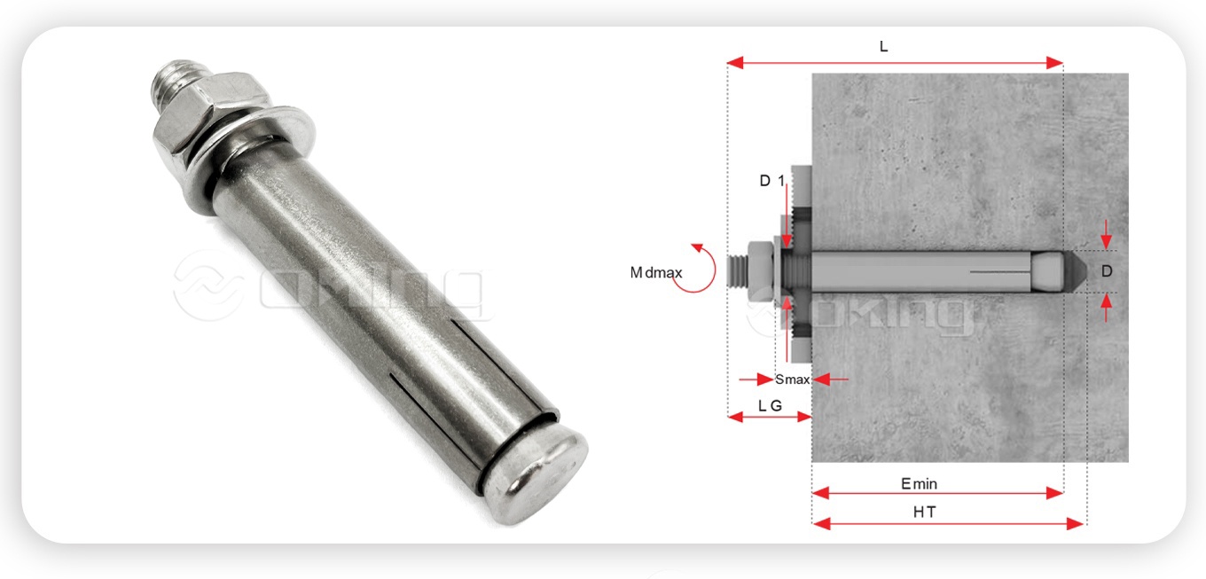 | 볼트 크기 | 소매 크기 | 드릴 구멍 직경 | 드릴 길이 | 최소 매립 | 최대. 고정물량 | 고정구 구멍 직경 | 최대 토크 | 길이 |