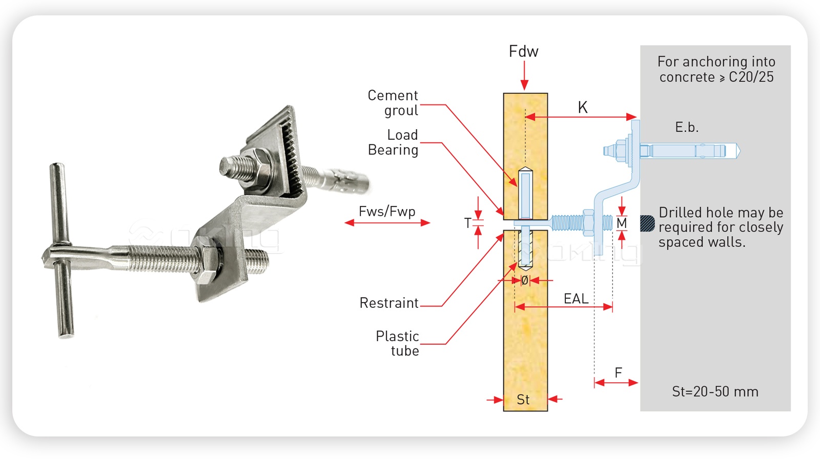 볼트 앵커의 적용 예앵커는 확장 볼트를 사용하여 내력벽에 고정됩니다.